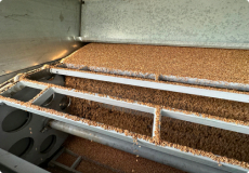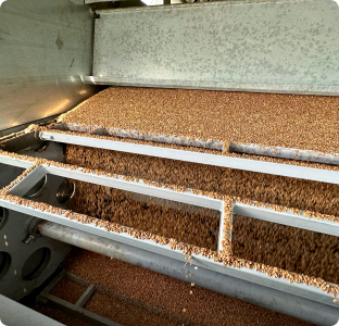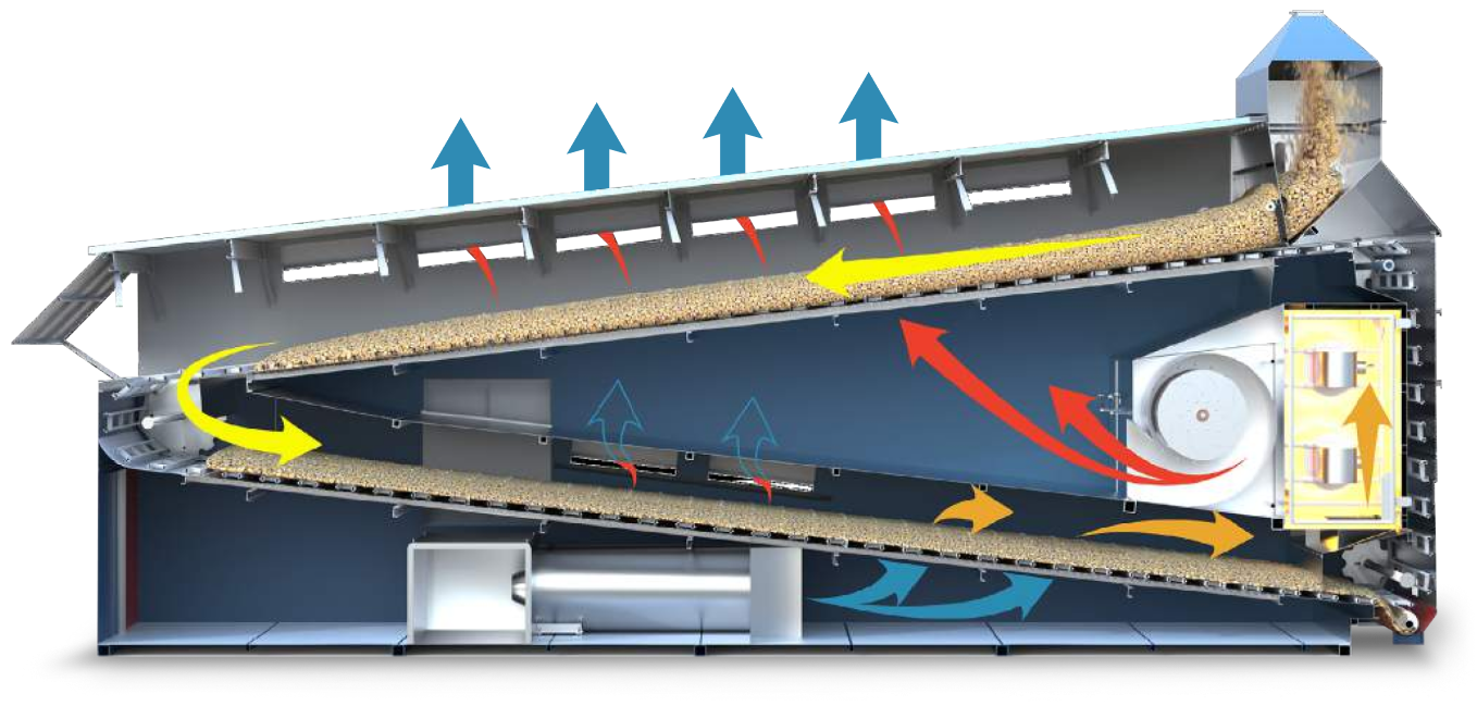 Зерно перемещается по ложу из нержавеющей стали с помощью экранов, которые толкают его. На сушилке установлены две горелки (дизельные или газовые), которые создают горячий воздух. Этот воздух подается в камеру сушки через авиационную заслонку (вентилятор).